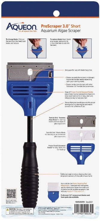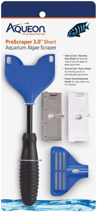 The ProScraper 3.0 Short Aquarium Scraper is great for removing buildup from aquariums and hard-to-reach corners. The scraper comes with a stainless-steel blade and a plastic blade to suit all cleaning needs. It also comes with a frozen food and seaweed feeder for a fun, clean and interactive way to feed your fish. It features a rubberized grip to reduce slipping when wet and to properly fit the palm of your hand. The strong fiberglass handle provides the proper leverage for any cleaning job and resists corrosion for a lifetime of use. The Twist & Click design makes it easy to switch your blades or replace them when they become worn. To change the blade, click out the tabs from the head, twist blade and remove. To replace the blade, insert blade at an angle, twist and click in the blade tabs to lock into the head. Replacement blades also available.